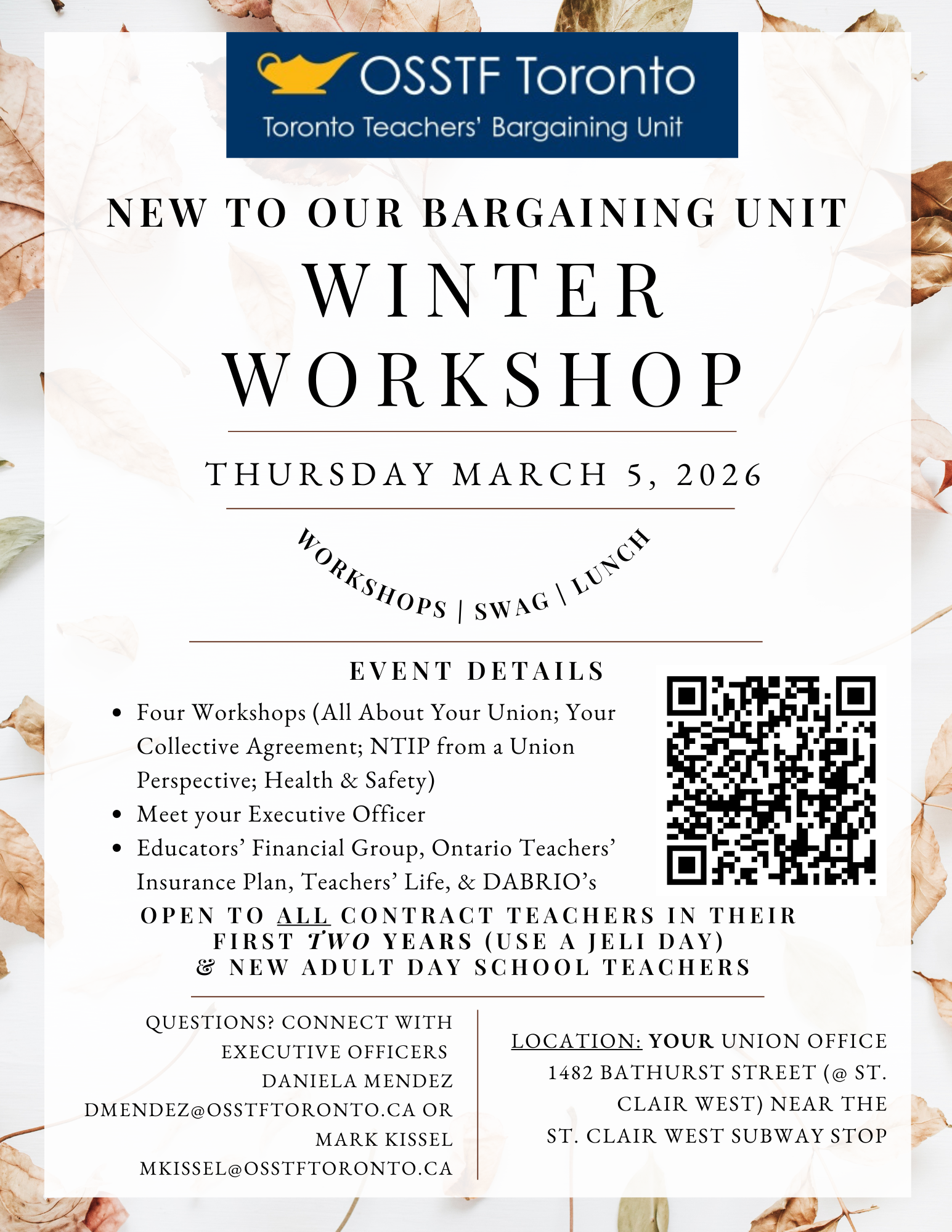 All Contract & Adult Day School Teachers that are New to the Toronto Teachers’ Bargaining Unit in the past two years are invited to the Winter New to our Bargaining Unit Workshop on March 5, 2026.